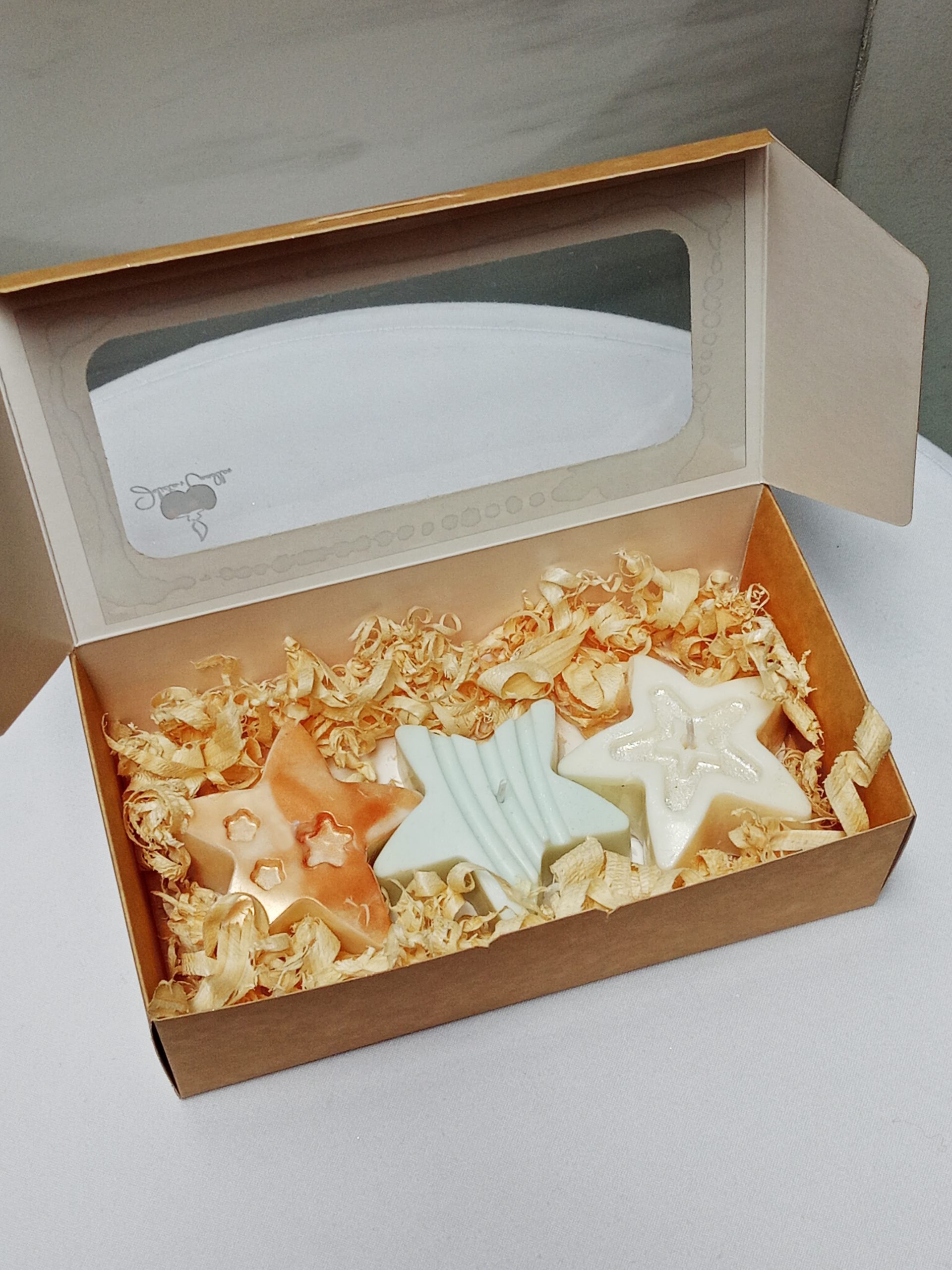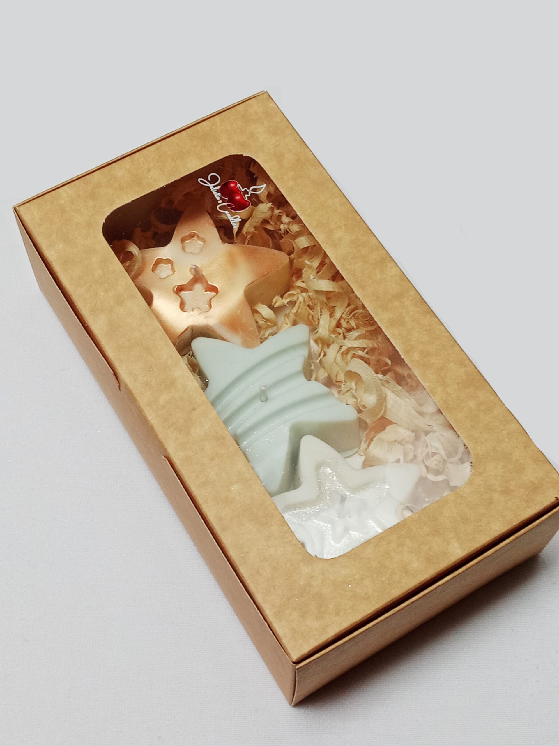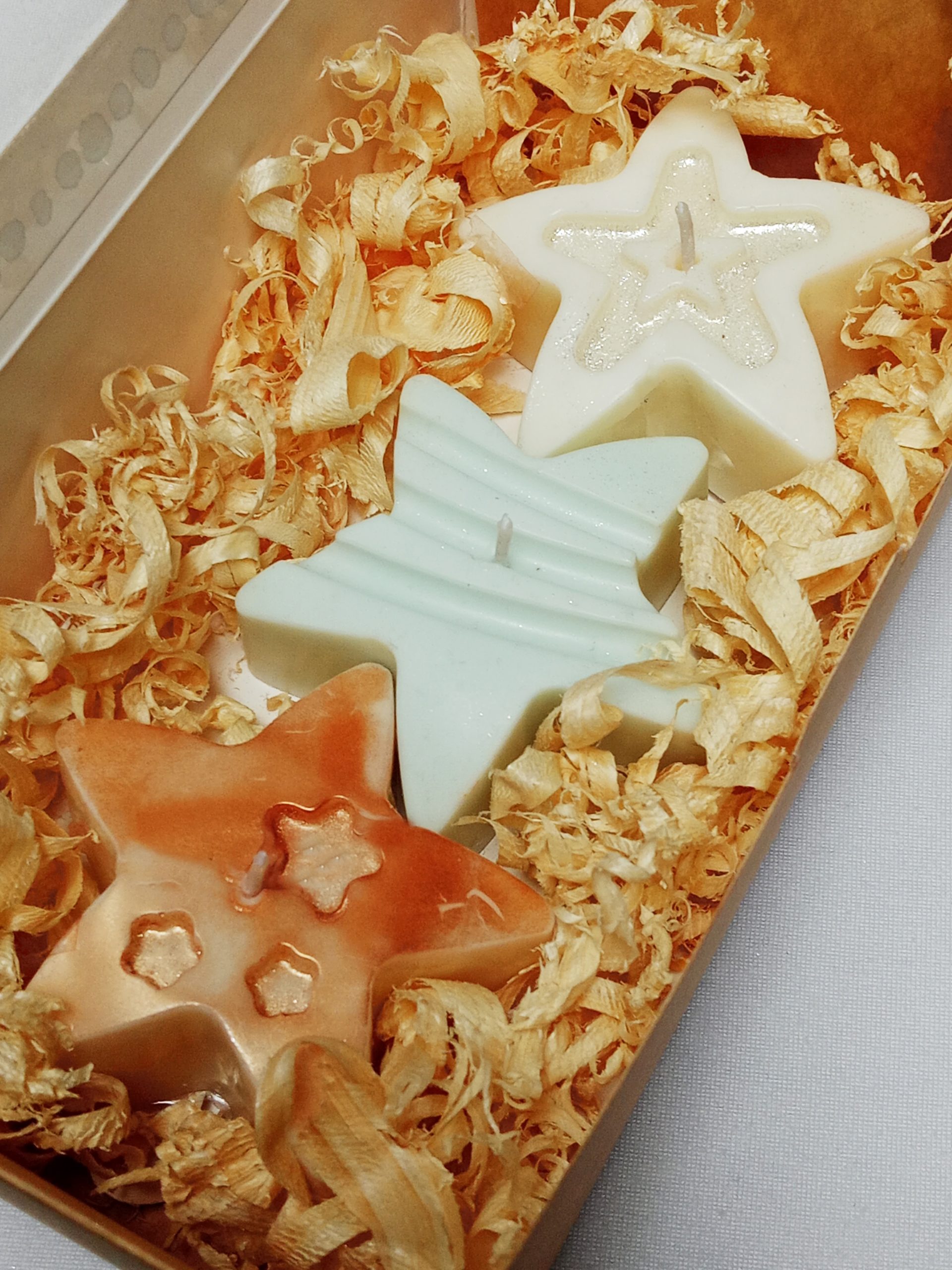 Kit de tres velas en forma de estrella, en colores cromados y elaboradas en cera 100% natural. Presentadas en una caja elegante con finas virutas decorativas, creando un detalle sofisticado y perfecto para regalar o decorar con brillo y estilo.